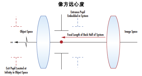物方遠心度由入射光瞳在物方內的位置定義,像方遠心度可以由位于物方內無限遠處的出射光瞳定義。圖4中顯示了這一情形。