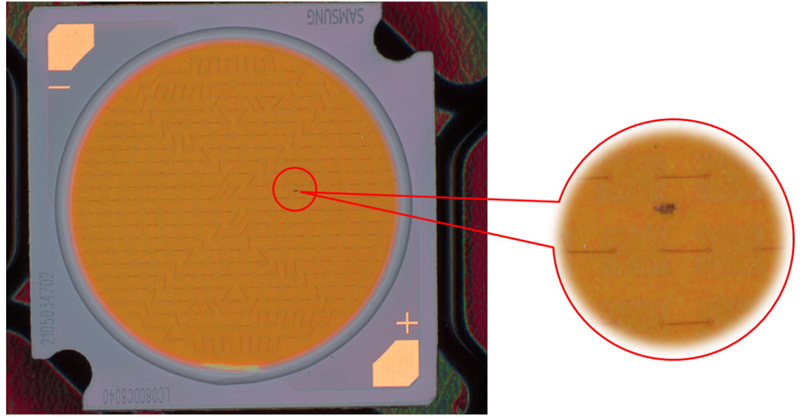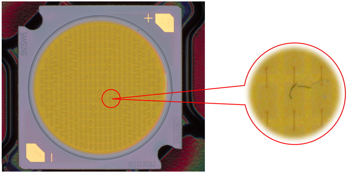 說明:燈珠表面有膠通過高角度垂直照射,凸顯出劃傷。