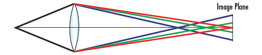 顏色焦距對應圖(圖2)與鏡頭聚焦與其等距的所有波長的能力相關。光源顏色波長不同,工業鏡頭的最佳聚焦面也不同。這種與波長相關的焦距變換會導致圖像對比度降低,因為不同波長會在相機傳感器所在的圖像平面上生成不同大小的光斑。在圖2的圖像平面中,顯示了紅色波長生成的小光斑、綠色波長生成的較大光斑,以及藍色波長生成的最大光斑。一次不能聚焦所有顏色。