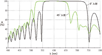 由于多層膜的各層薄膜的相對厚度,在射入傾斜光線時,光線通過薄膜中的光程會變長。因此,入射角度為0度(垂直)時,波長特性在最長波長一側(cè),入射角度變大時,向較短波長一側(cè)移動。
