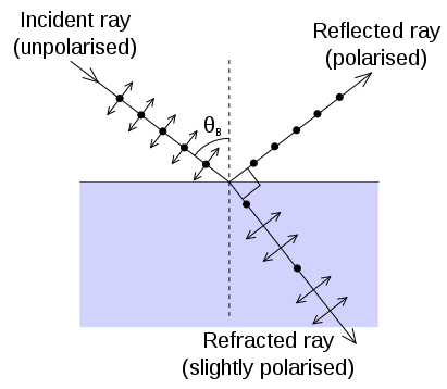 布儒斯特角,又稱偏振角(Brewster’s angle),是自然光經(jīng)電介質(zhì)界面反射后,反射光為線偏振光所應(yīng)滿足的條件。首先由英國物理學(xué)家D.布儒斯特于1815 年發(fā)現(xiàn)。自然光在電介質(zhì)界面上反射和折射時,一般情況下反射光和折射光都是部分偏振光,只有當(dāng)入射角為某特定角時反射光才是線偏振光,其振動方向與入射面垂直,此特定角稱為布儒斯特角或起偏角,用θb表示。此規(guī)律稱為布儒斯特定律。光以布儒斯特角入射時,反射光與折射光互相垂直。