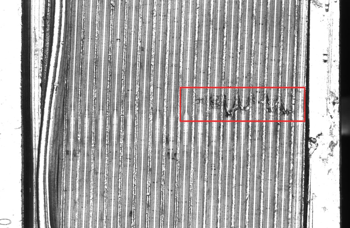 檢測(cè)火花塞螺牙缺陷,火花塞為圓柱形,使用線陣相機(jī)可良好展開(kāi)螺牙,使用隧道線光源可使整個(gè)螺牙照射均勻,缺陷凸顯。