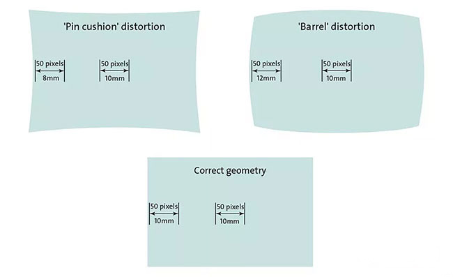 除了分辨率的變化外,所有透鏡也會受到一定的空間畸變。圖2顯示了如何以非線性方式拉伸或壓縮圖像,使整個傳感器的精確測量變得非常困難。雖然有一些軟件方法可以解決這個問題,但它們無法考慮物體的物理深度,因此最好選擇質量好的低失真鏡頭,而不是試圖在軟件中糾正這些錯誤。作為一般規(guī)則,較短焦距的鏡頭將具有比具有較長焦距的鏡頭更大的失真,因為光從更大的角度照射到傳感器。使用更復雜的鏡頭設計,可以保持低失真,并且許多鏡頭制造商一直在努力研究他們的光學設計,使他們能夠將空間失真降低到0.1%的數(shù)量級。