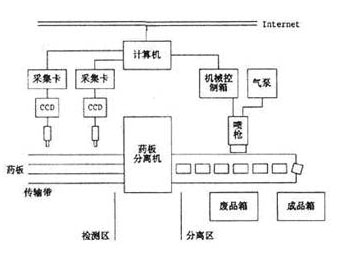 基于機器視覺技術的藥片包裝缺損檢測系統的硬件包括攝像系統和分離系統兩部分。