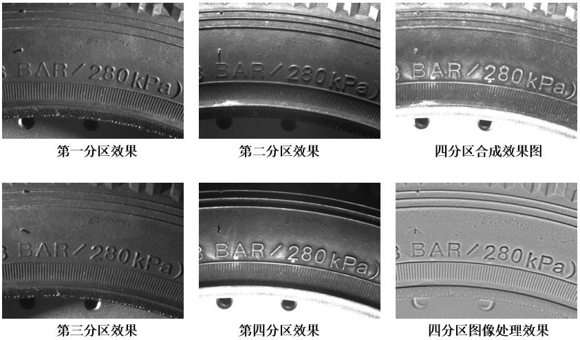 輪胎四個(gè)不同方向的成像都未能充分呈現(xiàn)字符。經(jīng)過多分區(qū)光源的照明,并借助光度立體算法,我們獲得了高對比度的圖像,這為算法的穩(wěn)定識別提供了可靠的圖像數(shù)據(jù)。