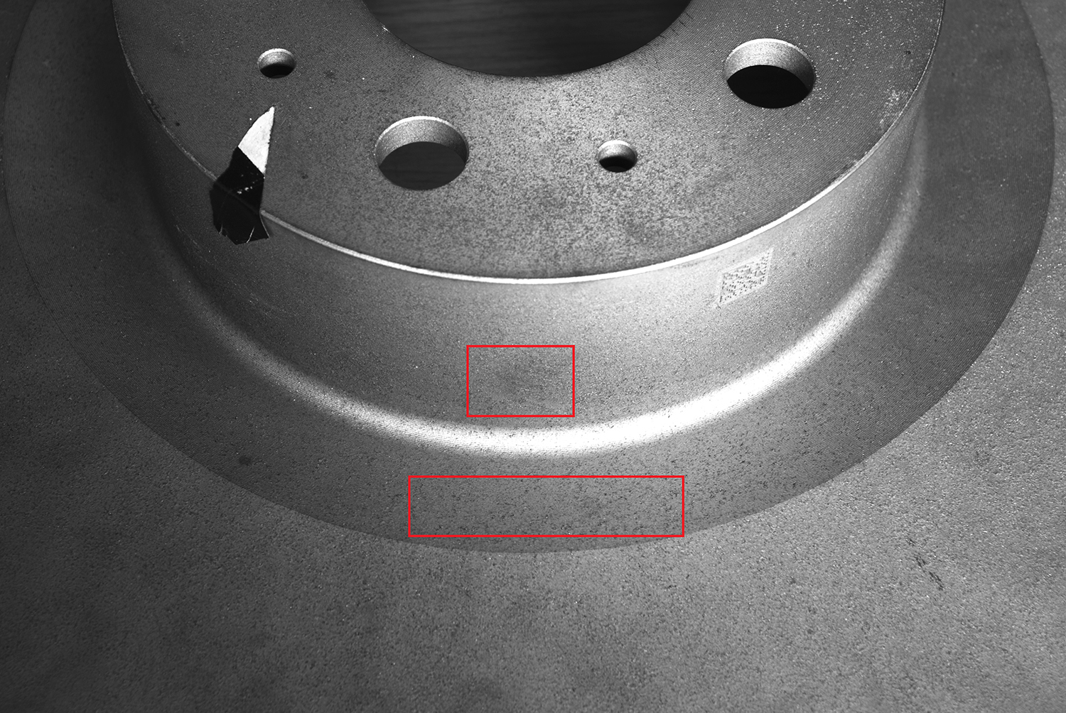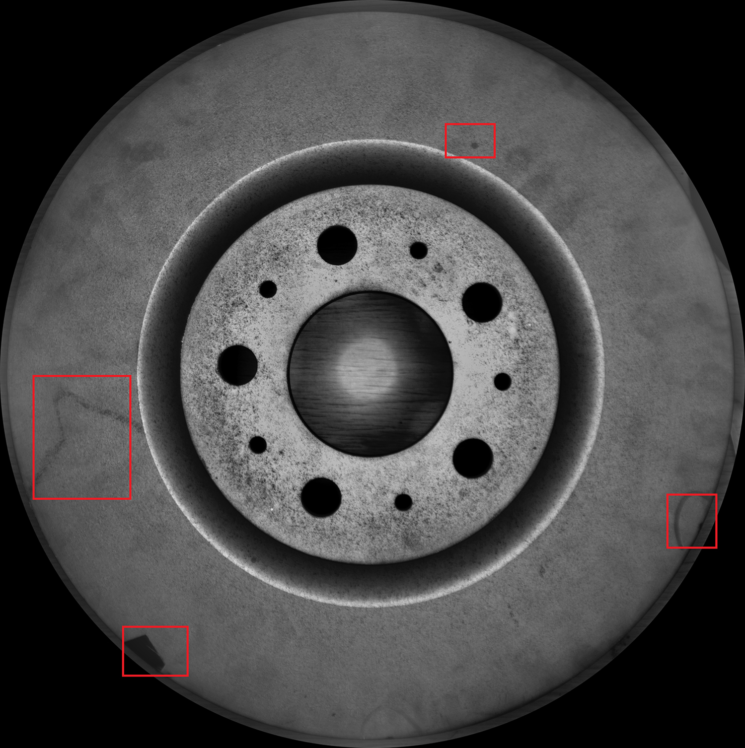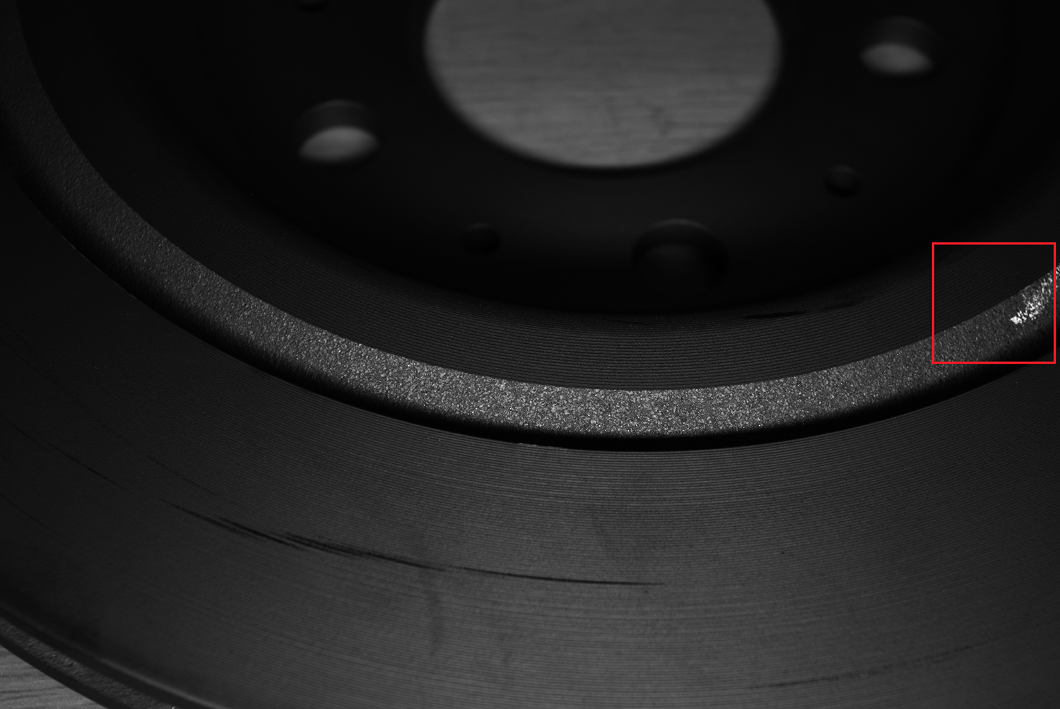 剎車盤正面尺寸大(直徑 30-40cm)且?guī)峤睿ǜ叩筒?1-2cm),普通光源易產(chǎn)生陰影。采用“大景深短焦鏡頭結(jié)合開孔面光源”組合,鏡頭覆蓋高低差區(qū)域避免失焦,面光源均勻照射消除陰影。測試顯示,0.5mm 劃痕、0.3mm 砂眼呈明顯黑色,與淺灰色背景對比清晰,無漏判(如圖1所示)。