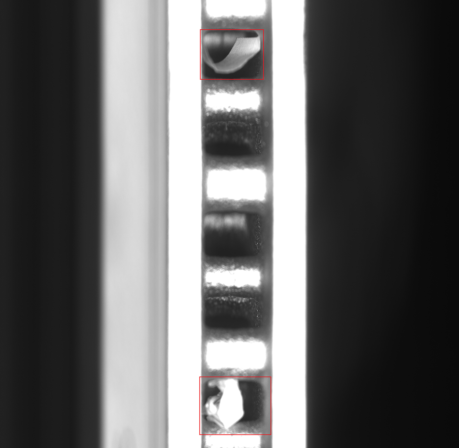 風道斜面空間狹窄(寬 1-2cm、深 3-5cm),普通光源難以深入。環(huán)繞式安裝多臺相機協(xié)同工作,共用一個光源照射,同步控制采集圖像。與風道內(nèi)壁對比明顯,避免了光照不足導致的漏判(如圖3所示)。