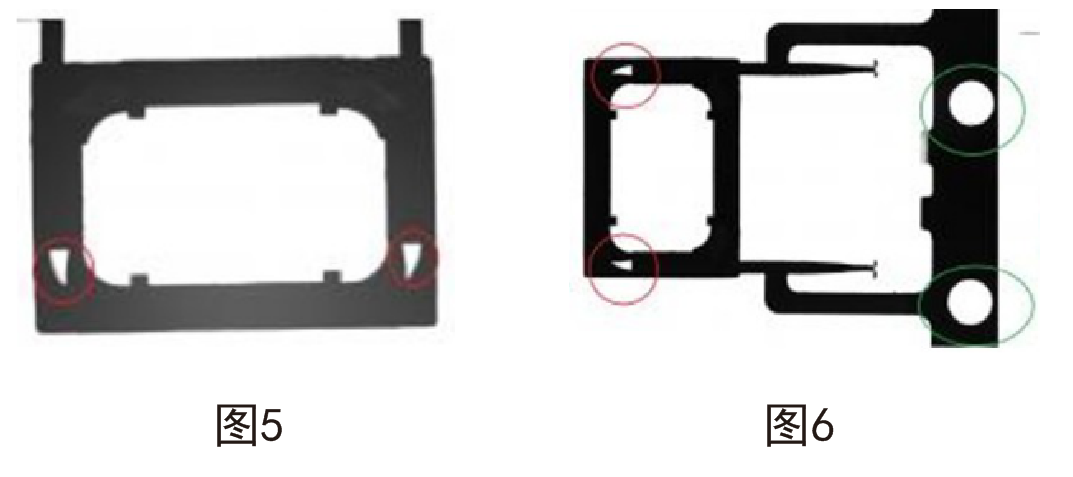 圖5,用普通的鏡頭拍攝,由于視覺誤差和聚焦不準,所以在拍攝塑膠模具的透氣孔時(紅圈圈定),出現(xiàn)內(nèi)壁可見,邊緣提取不清晰,有陰影的現(xiàn)象,對識別造成影響,數(shù)據(jù)不準確。