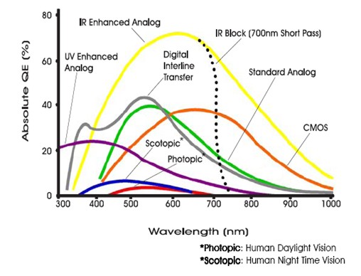 對檢測來說,最好的光源顏色(頻率)依靠兩個因素:被檢測物體的顏色和CCD的頻譜響應(yīng)。下面兩圖分別是常見光源和接收器的頻譜響應(yīng)曲線和色輪圖。彩色CCD通常需要白色的照明光源,盡管這不是一成不變的。可以通過實驗不同顏色的光來增加圖像的對比度,從而使單色檢測得到加強(qiáng)。色輪對于選擇單獨頻率的光源來增大圖像對比度很有幫助。通常用相反色溫的顏色照射,可以達(dá)到最高級別的對比度,冷色照射暖色圖像變暗,照射其它的冷色則變亮。