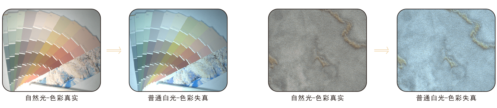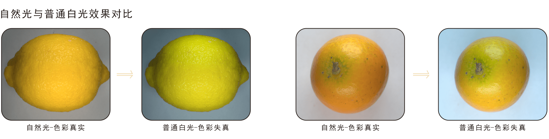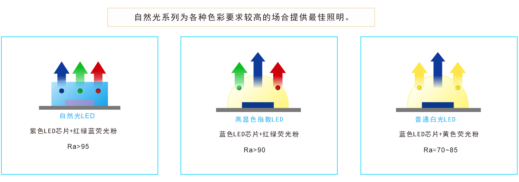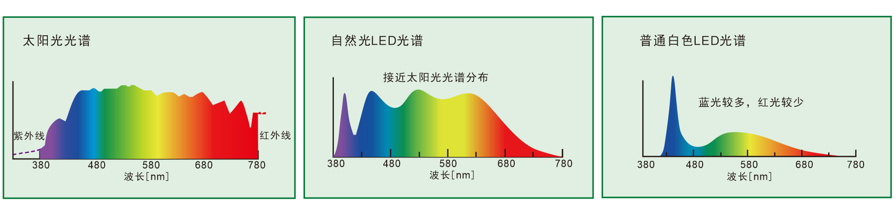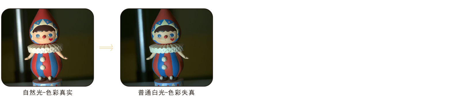 太陽光可以輻射連續的光譜,在可見光的波長(380nm—780nm)范圍內,包含著紅、橙、黃、綠、青、藍、紫等各種顏色的光。物體在太陽光的照射下,可以顯示出它真實的顏色,但當物體在非連續光譜的LED的照射下,顏色就會有不同程度的失真。我們把光源對物 體真實顏色的呈現程度稱為光源的顯色性,顯色性用顯色指數(Ra)Ra值越大,則代表光源顯色性越好,越接近太陽光。