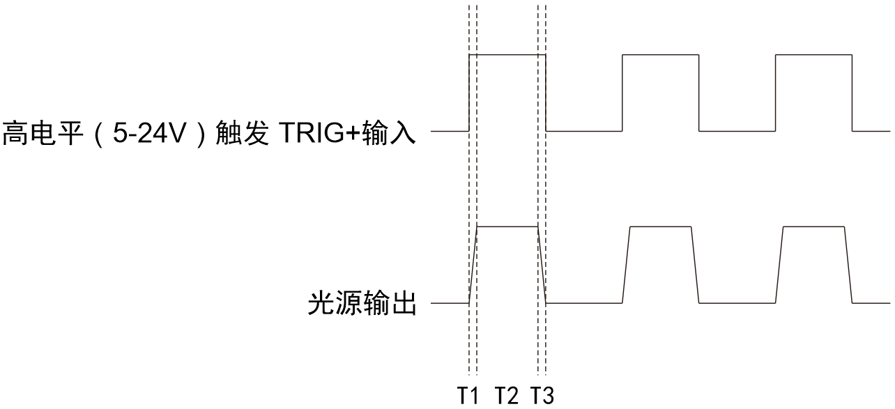 說明:T1觸發光源打開延時時間,T2光源被觸發后點亮時間,T3觸發光源關閉延時時間,T1≤10us,T3≤10us。