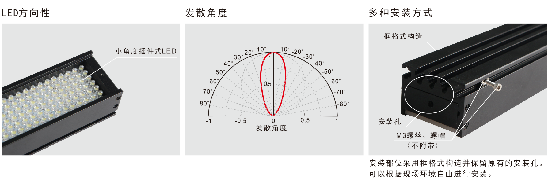 1.采用小角度LED陣列設(shè)計(jì),亮度高