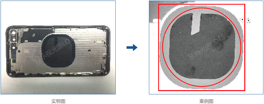 手機邊殼帶點曲面,使用方形無影光源向邊殼各個方向均勻照射,邊緣輪 廓明顯,達到檢測目的。