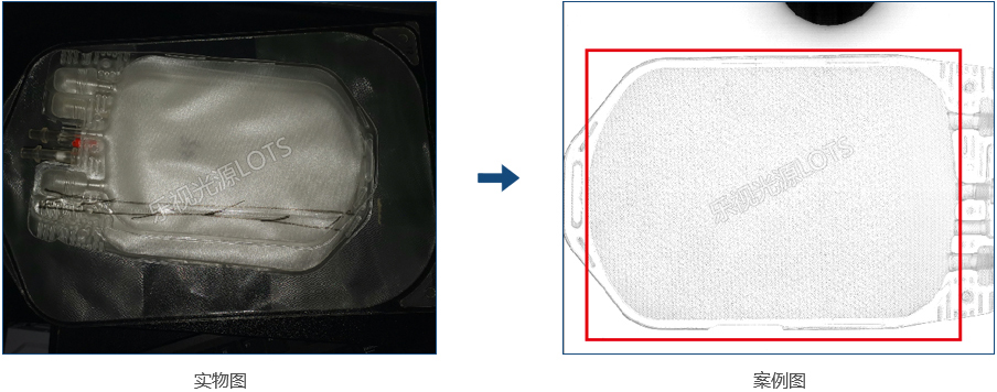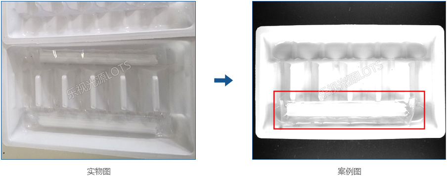 使用紅外背光源打穿產品,由于輸液軟管與需插入硬管材質不同,兩者呈現不同灰度,實現檢測目的。