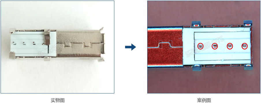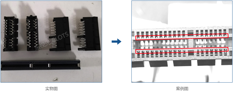 連接器針腳未露在塑膠表面,形狀大小不一,同軸光垂直照射,使塑膠內部 針腳均勻,穩定的呈現。
